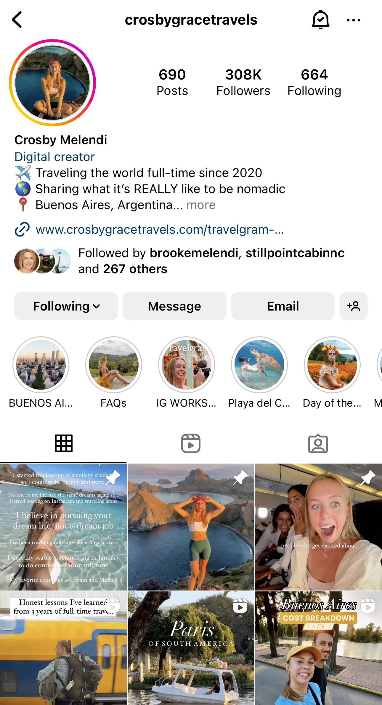 Since launching @crosbygracetravels in 2018, I’ve grown my audience to 308,000+ followers, reached 100+ million accounts on Instagram alone, and partnered with many well-known brands including Babbel, HP, Norwegian Cruise Line, EF Gap Year, Harvest Hosts, and Airalo.